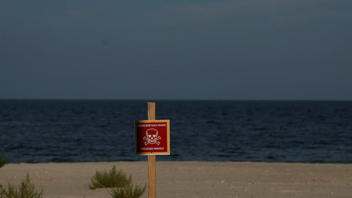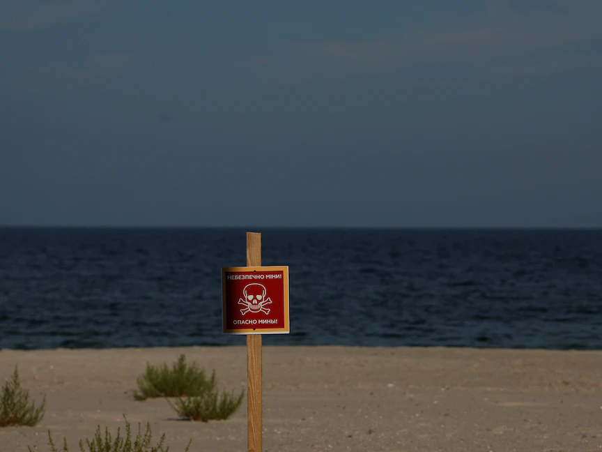 لافتة تحذر من وجود ألغام في المياه في أوديسا الأوكرانية. - REUTERS