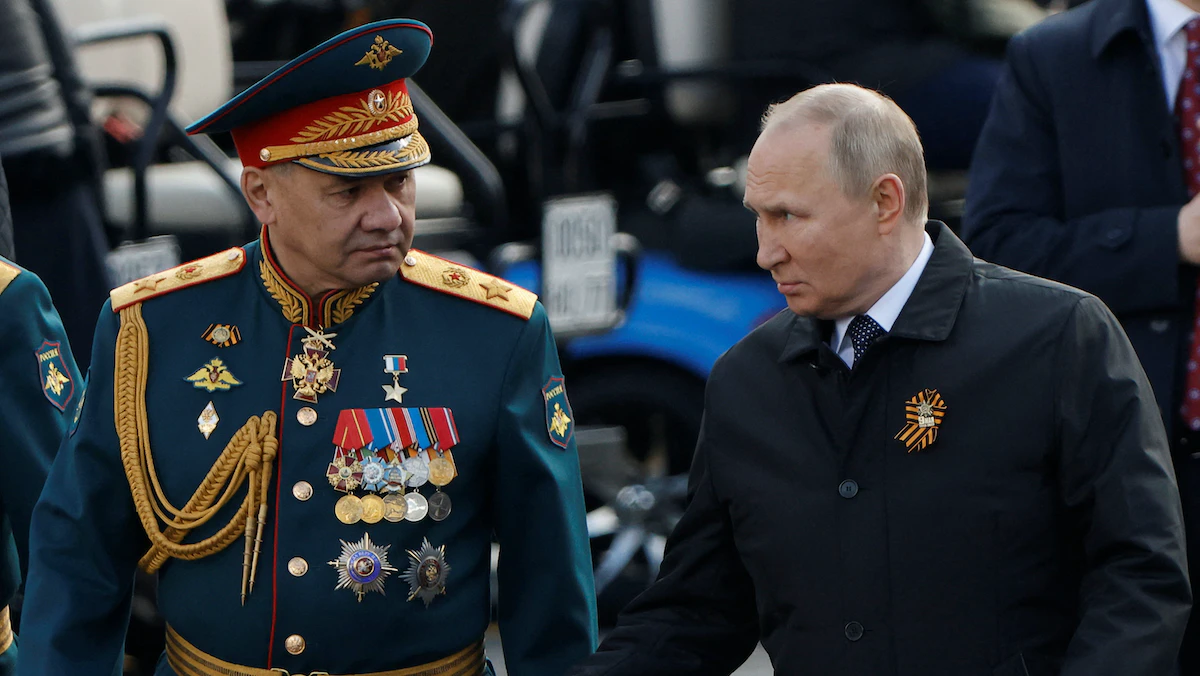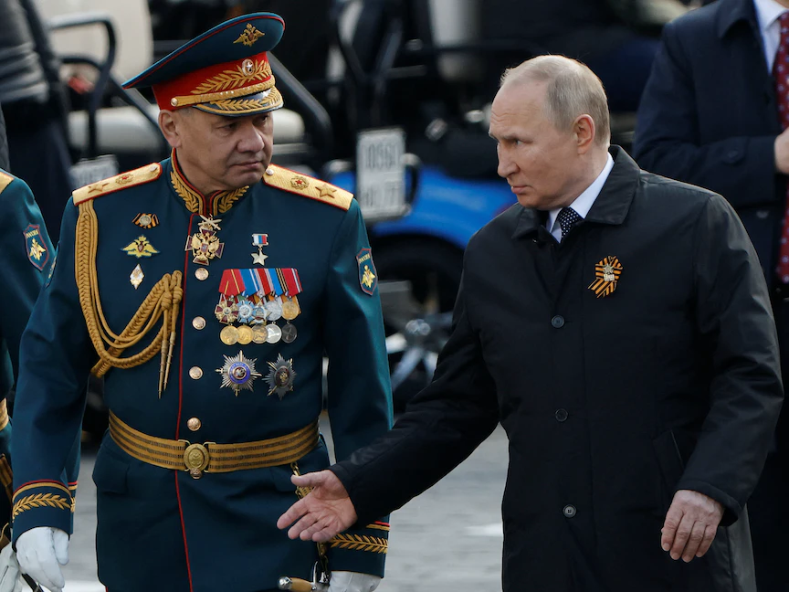 الرئيس الروسي فلاديمير بوتين ووزير الدفاع سيرجي شويجو يتحدثان بعد عرض عسكري في يوم النصر - 9 مايو 2022 - REUTERS