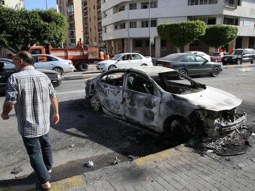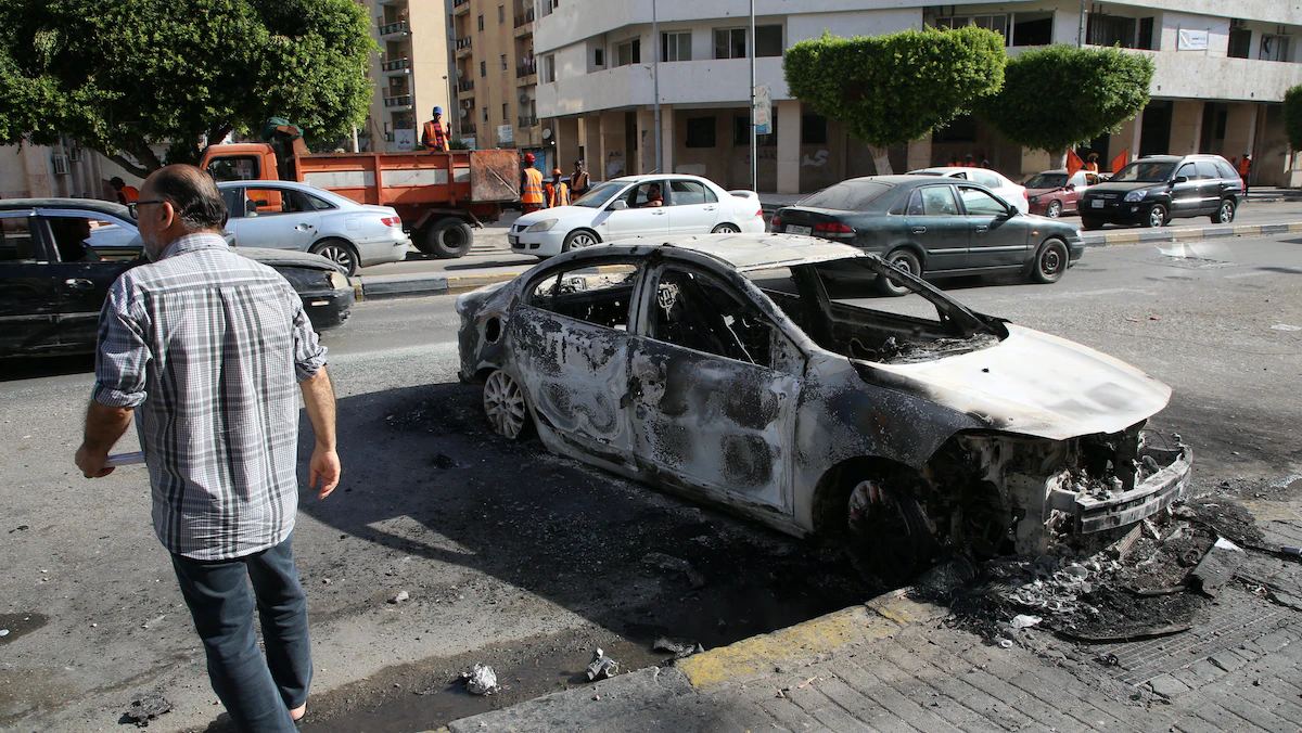رجل يسير بجوار سيارة محترقة بعد اشتباكات طرابلس، ليبيا 28 أغسطس 2022 - REUTERS