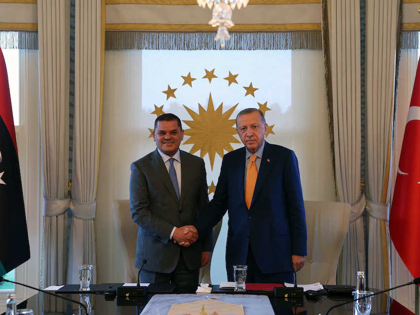 قال رئيس الحكومة الليبية المقالة من البرلمان عبد الحميد الدبيبة إنه اتفق مع الرئيس التركي رجب طيب أردوغان خلال لقاء في إسطنبول، الجمعة، على ضرورة إيجاد خارطة طريق سياسية يتم دراستها، تنتهي بانتخابات "بتواريخ معينة"، مشيراً إلى أن أنقرة أكدت دعمها له في هذا الصدد.