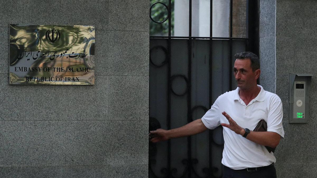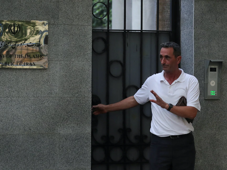 رجل يخرج من السفارة الإيرانية بتيرانا بعد أن قطعت ألبانيا علاقاتها مع طهران وأمرت الدبلوماسيين بالمغادرة بسبب هجوم إلكتروني ، في تيرانا ، ألبانيا- 7 سبتمبر 2022 - REUTERS