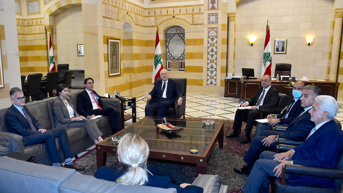 الوسيط الأميركي بمفاوضات ترسيم الحدود البحرية بين إسرائيل ولبنان آموس هوكستين خلال لقائه مع رئيس الحكومة اللبنانية نجيب ميقاتي في بيروت- 9 سبتمبر 2022 - AFP