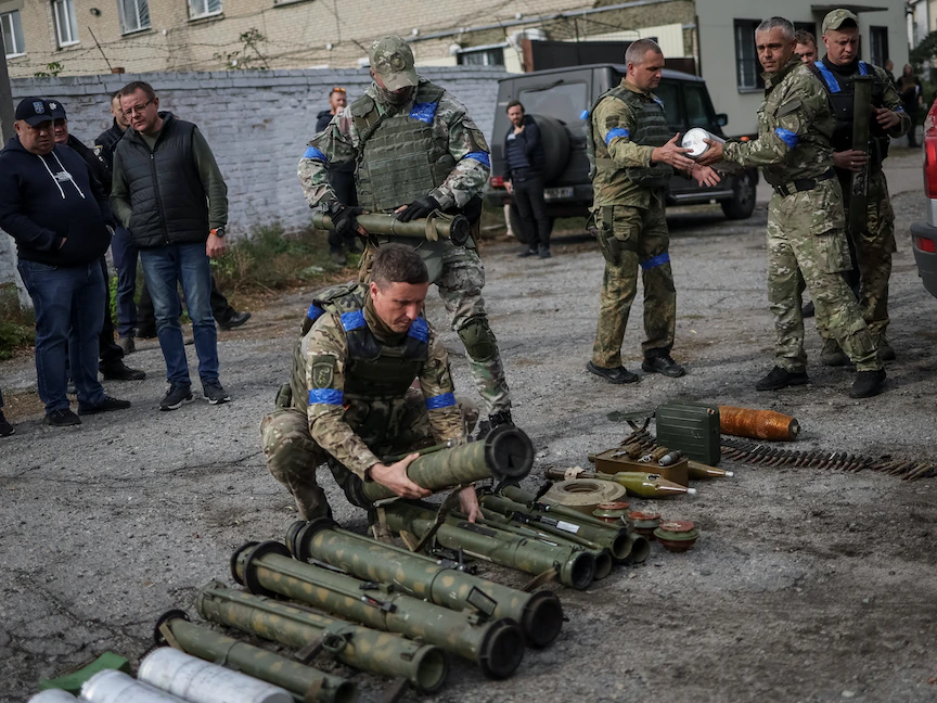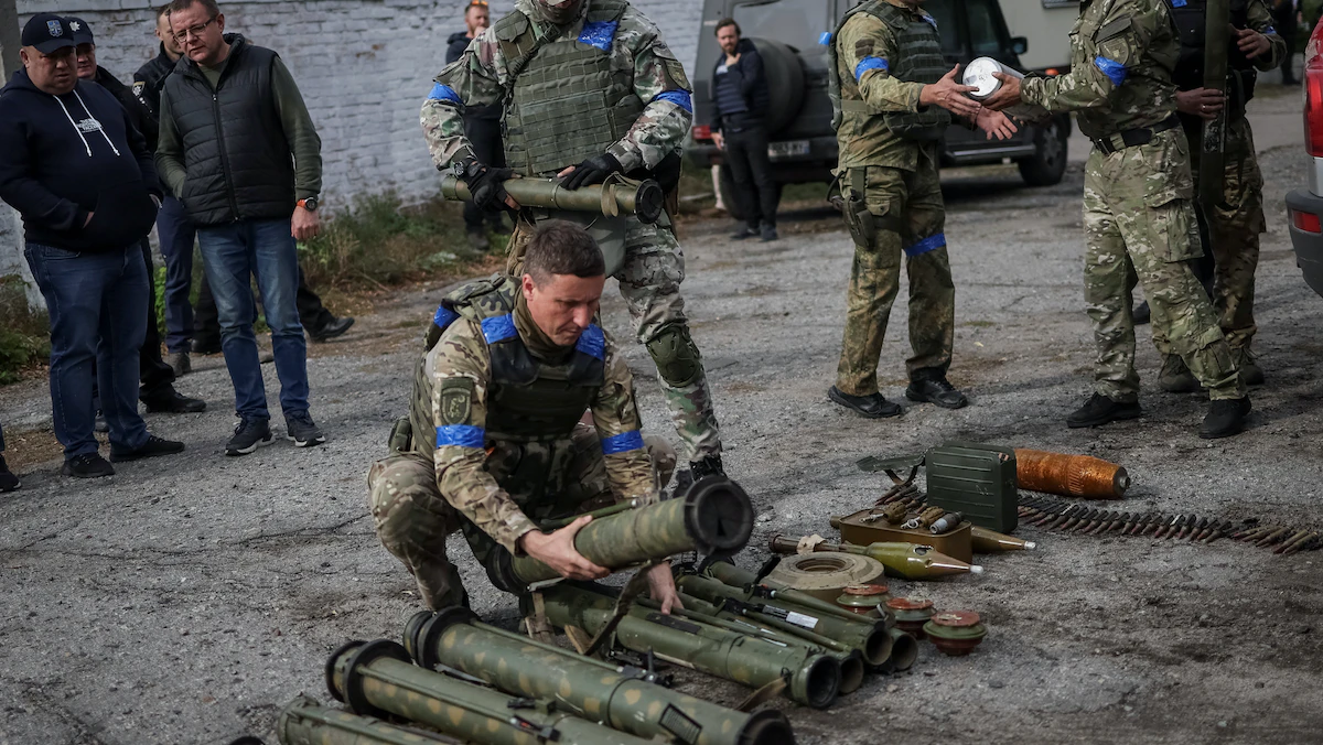 قوات أوكرانية تجمع قذائف وألغاماً وأسلحة بعد سيطرتها على قرية أوديفي خاركوف - أوكرانيا - 12 سبتمبر 2022 - REUTERS