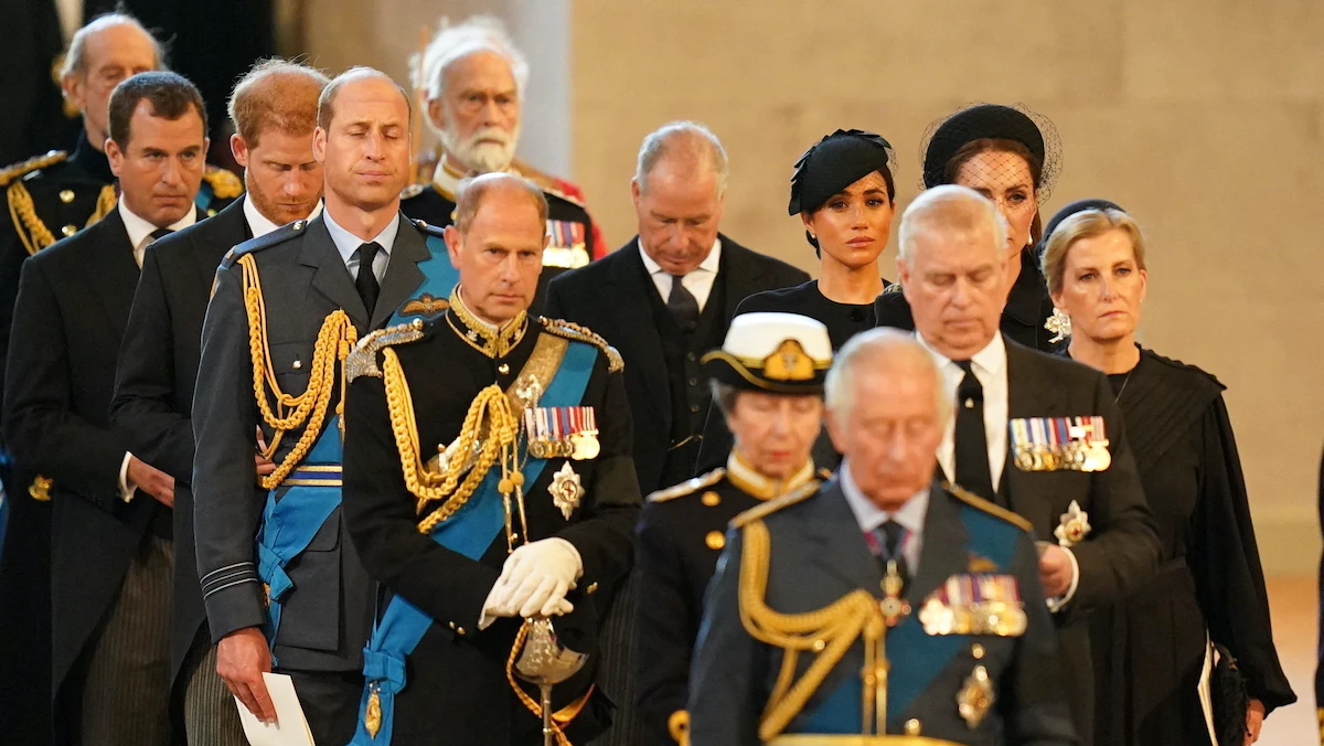 الملك تشارلز الثالث يتقدم الأسرة الملكية خلال حمل نعش الملكة إليزابيث الثانية إلى قاعة وستمنستر في لندن، 14 سبتمبر 2022. - REUTERS
