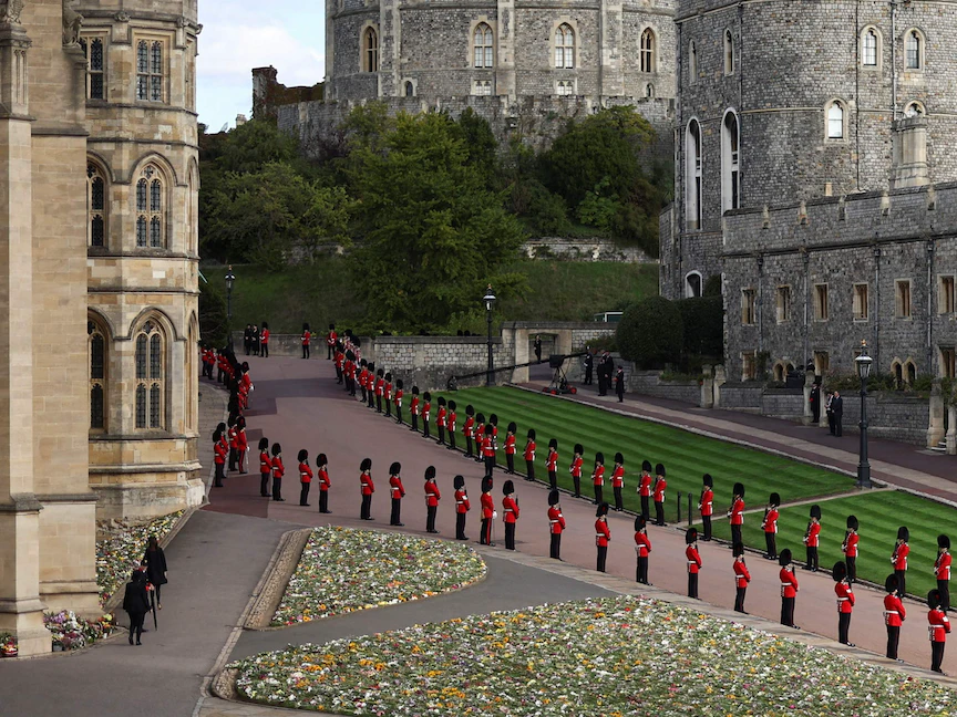 ووصل النعش في مسيرة ومشى وراءه نجلها الملك تشارلز البالغ 73 عاما وأبناء الملكة الآخرون آن، وأندرو، وإدوارد ووريث العرش وليام الذي بات أمير ويلز والأمير هاري باللباس المدني نظراً إلى انسحابه من نشاطات العائلة الملكية في 2020.