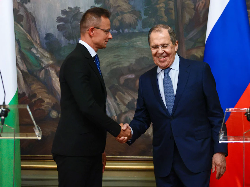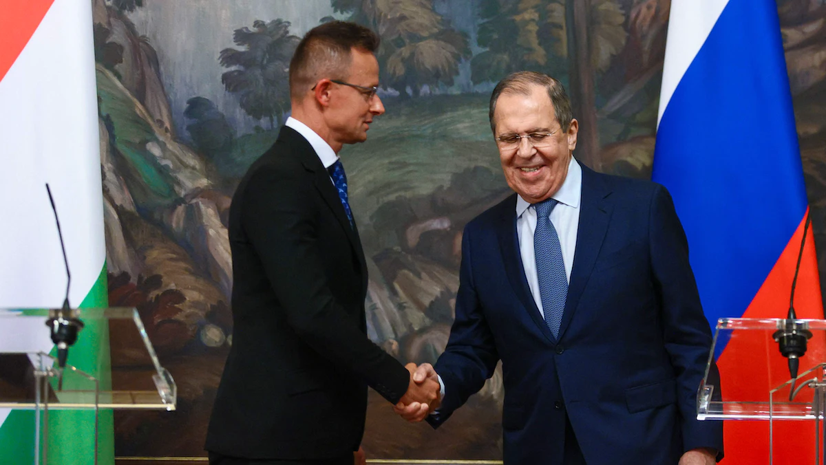 وزير الخارجية الروسي سيرجي لافروف يصافح وزير خارجية المجر بيتر زيجارتو في ختام مؤتمر صحافي مشترك عقب محادثاتهما في موسكو – 21 يوليو 2022 - AFP