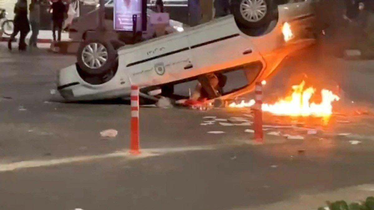 سيارة شرطة مقلوبة ومشتعلة في بوجنورد خلال احتجاجات شعبية - إيران - 22 سبتمبر 2022 - via REUTERS
