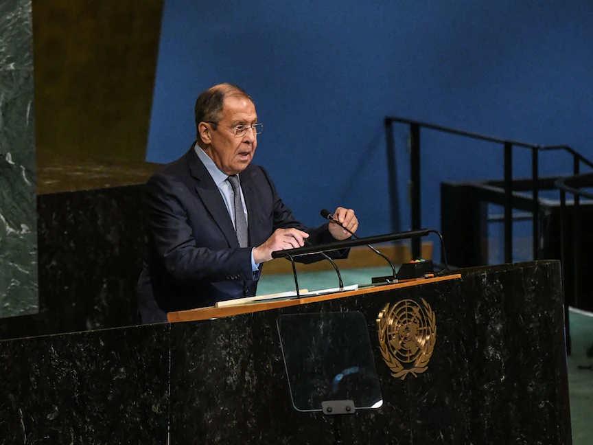 وزير الخارجية الروسي سيرجي لافروف يلقي خطاب بلاده أمام الجمعية العامة للامم المتحدة. 24 سبتمبر 2022 - AFP