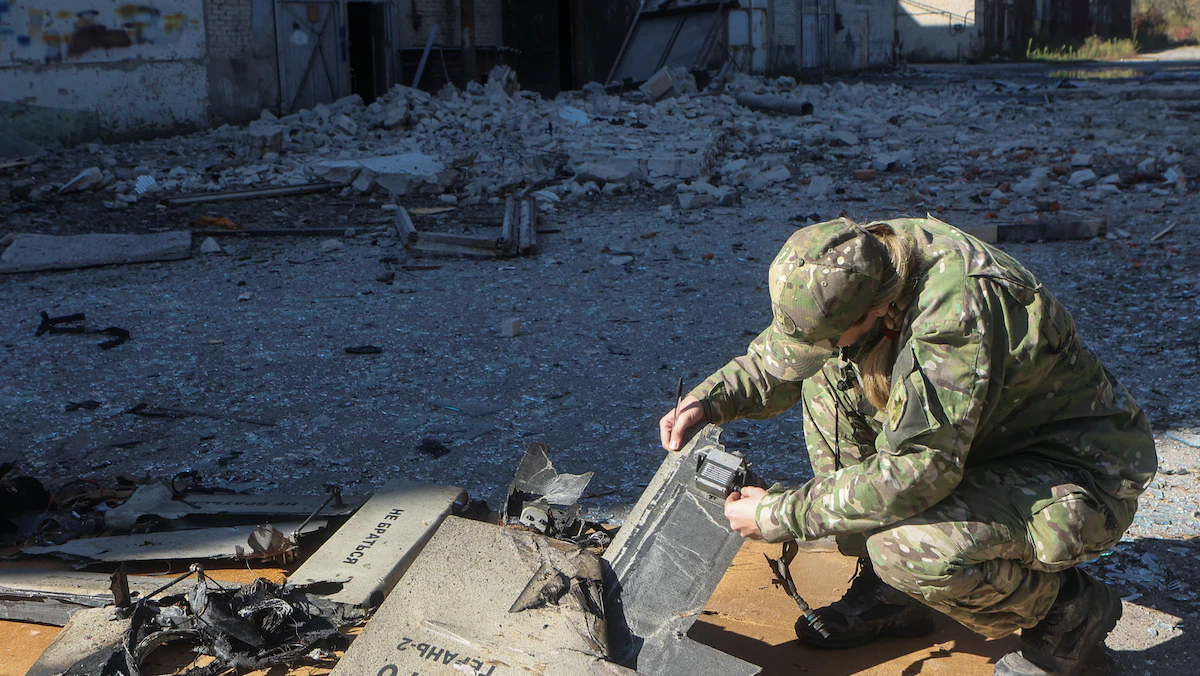 ضابط شرطة يتفقد أجزاء من طائرة بدون طيار، ما تعتبره السلطات الأوكرانية طائرة مسيرة إيرانية من نوع "شاهد-136"، في موقع غارة روسية على منشآت تخزين الوقود في خاركيف، أوكرانيا. 6 أكتوبر 2022. - REUTERS