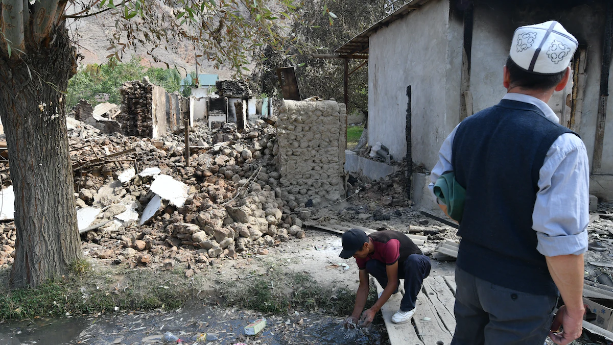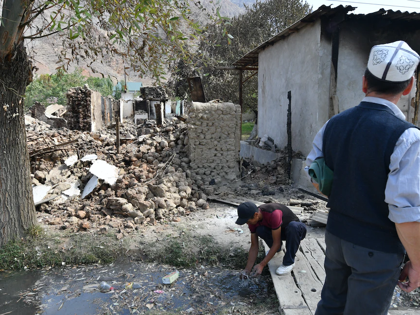 رجل يقف أمام منزل مدمر في قرية كابتشيجاي بالقرب من الحدود القيرجيزية الطاجيكية وسط أعنف اشتباكات بين الدولتين في سبتمبر - قيرجيزستان – 21 سبتمبر 2022 - AFP