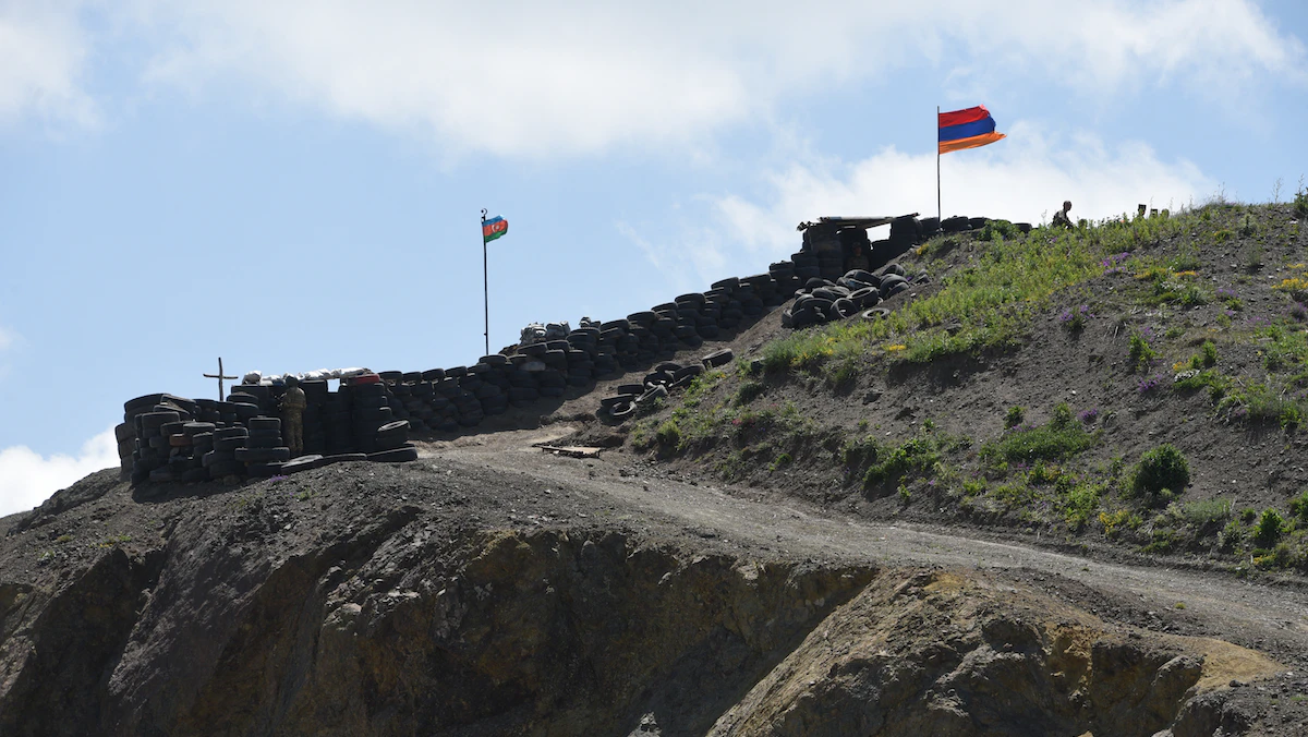 علما أرمينيا وأذربيجان عند نقطة حدودية بين البلدين. 18 يوينو 2021 - AFP