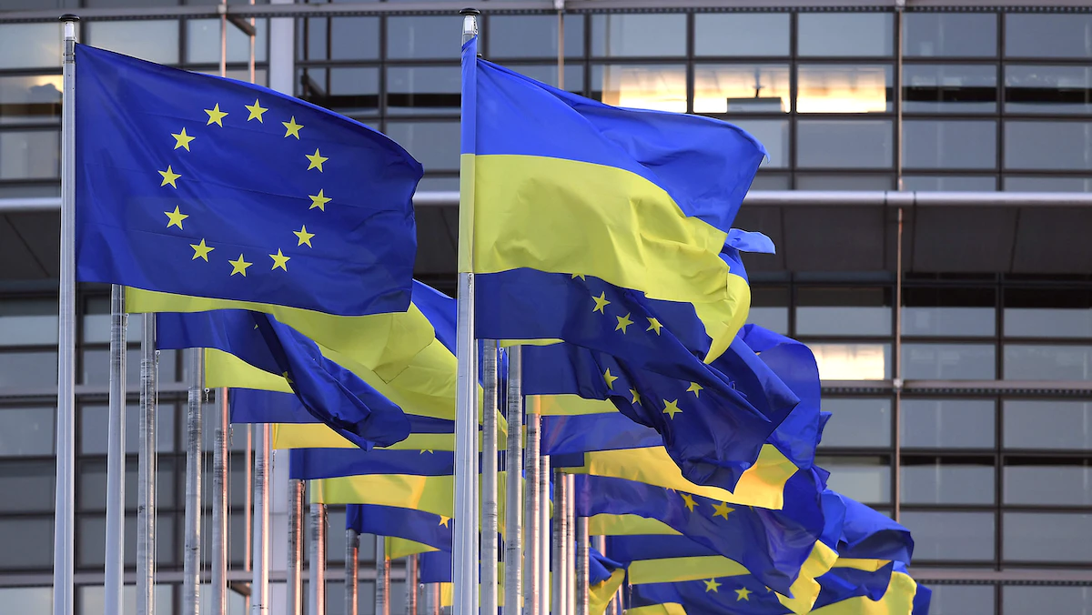 أعلام الاتحاد الأوروبي وأوكرانيا ترفرف بالقرب من البرلمان الأوروبي في ستراسبورج بشرق فرنسا. 7 مارس 2022 - AFP