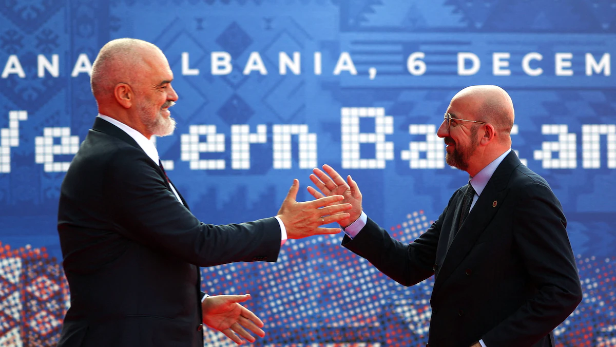 رئيس وزراء ألبانيا إيدي راما يرحب برئيس المجلس الأوروبي شارل ميشيل قبل قمة الاتحاد الأوروبي وغرب البلقان في العاصمة الألبانية تيرانا. 6 ديسمبر 2022 - REUTERS