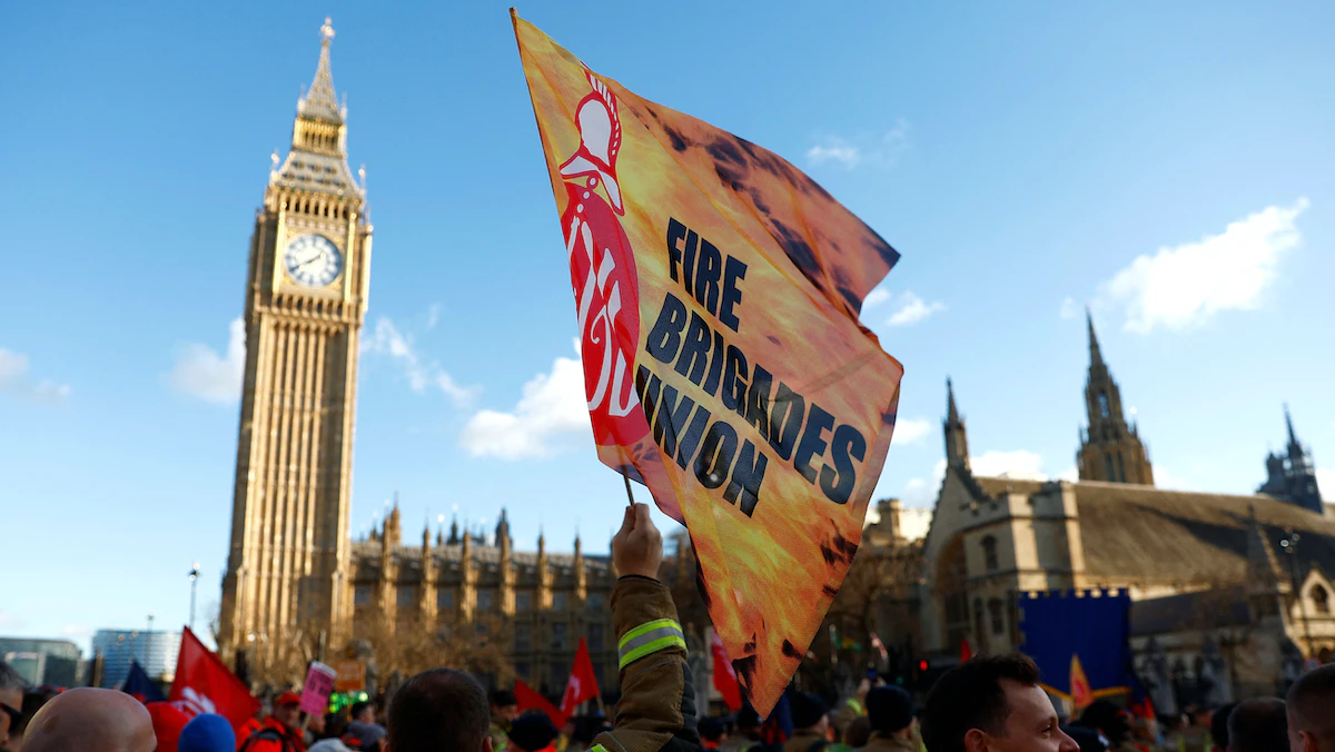 أعضاء من نقابة فرق الإطفاء خلال مسيرة تدعو للإضراب بسبب تكاليف المعيشة في لندن، 6 ديسمبر 2022 - REUTERS
