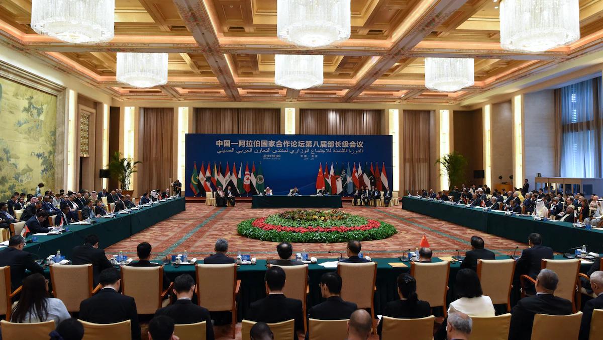 جانب من الاجتماع الوزاري الثامن لمنتدى التعاون بين الصين والدول العربية في قاعة الشعب الكبرى في بكين، 10 يوليو 2018 - AFP