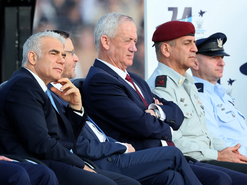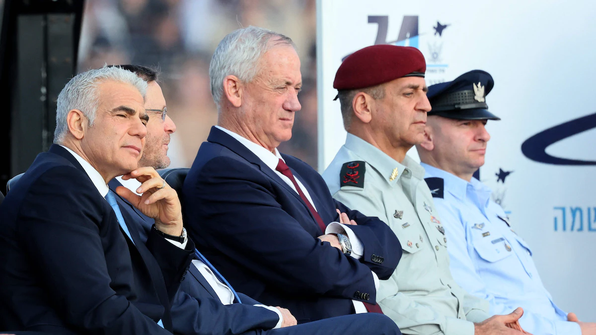 رئيس الوزراء الإسرائيلي يائير لبيد (يسار)، والرئيس إسحاق هرتسوج، وزير الدفاع بيني جانتس، ورئيس الأركان العامة أفيف كوخافي، وقائد سلاح الجو الإسرائيلي تومر بار، يحضرون حفل تخرج طيارين في قاعدة حتريم في صحراء النقب، 28 ديسمبر 2022 - AFP