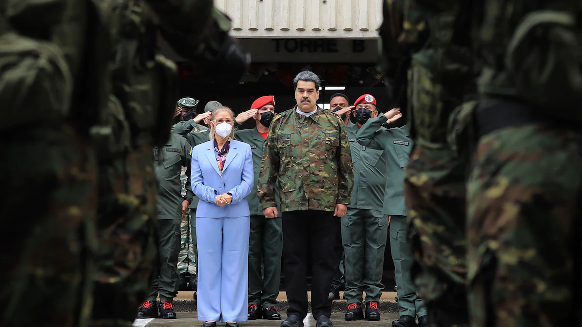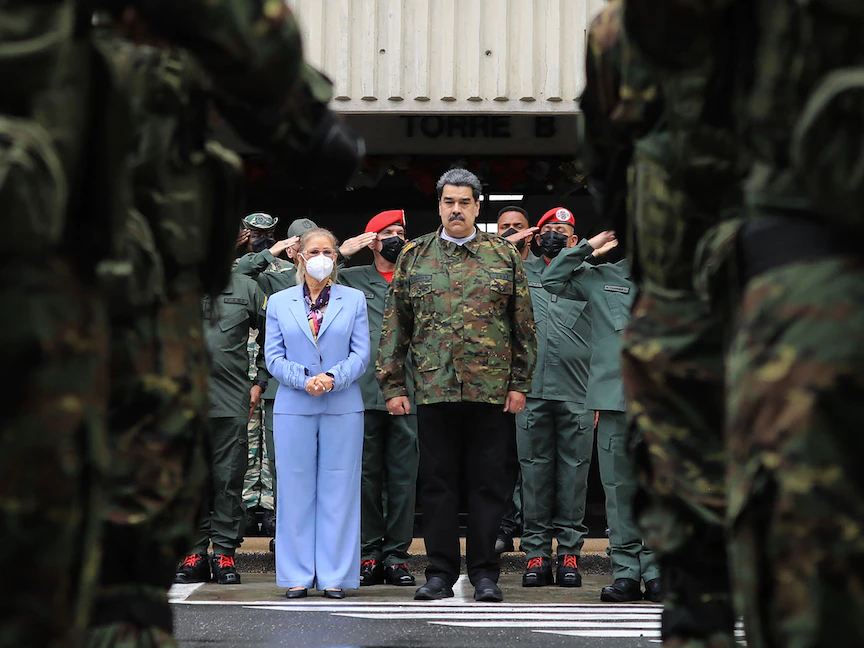 الرئيس الفنزويلي نيكولاس مادورو مرتدياً الزي العسكري وزوجته سيليا فلوريس، يحضران استعراضاً عسكرياً في وزارة الدفاع في كاراكاس. 28 ديسمبر 2022. - AFP