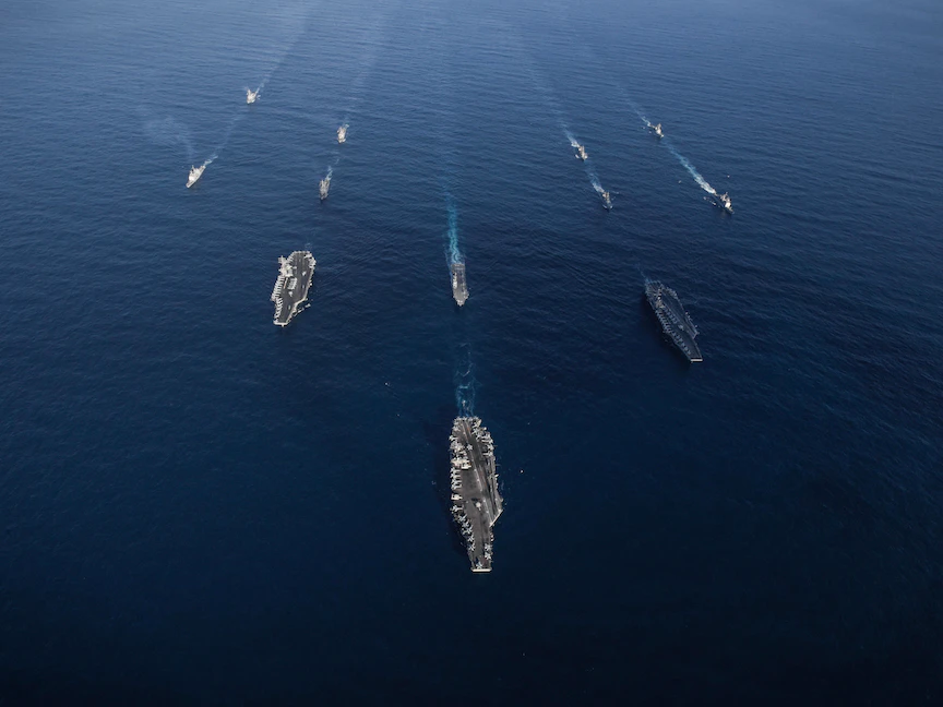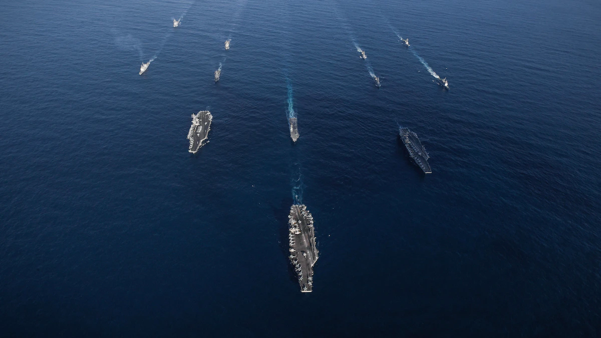 مجموعة سفن بينها "يو إس إس رونالد ريجان" الأميركية وسفن من قوة الدفاع الذاتي التابعة للبحرية اليابانية في المياه الدولية غرب المحيط الهادئ. 12 نوفمبر 2017 - REUTERS