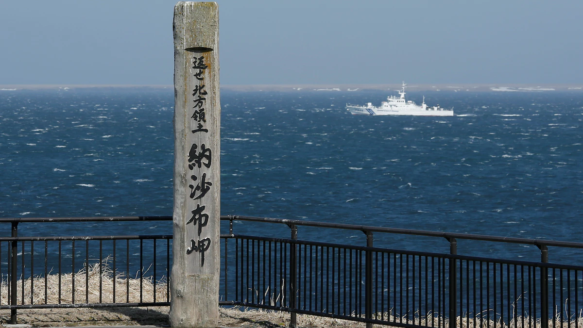 سفينة حربية قبالة سواحل هوكايدو شمال اليابان حيث يمكن مشاهدة جزر الكوريل في الأفق. 14 أبريل 2019 - REUTERS