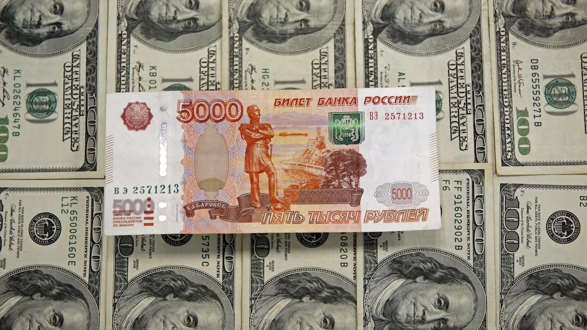 أوراق نقدية من فئة 100 دولار أميركي وفي الوسط ورقة الـ5 آلاف روبل روسي - REUTERS
