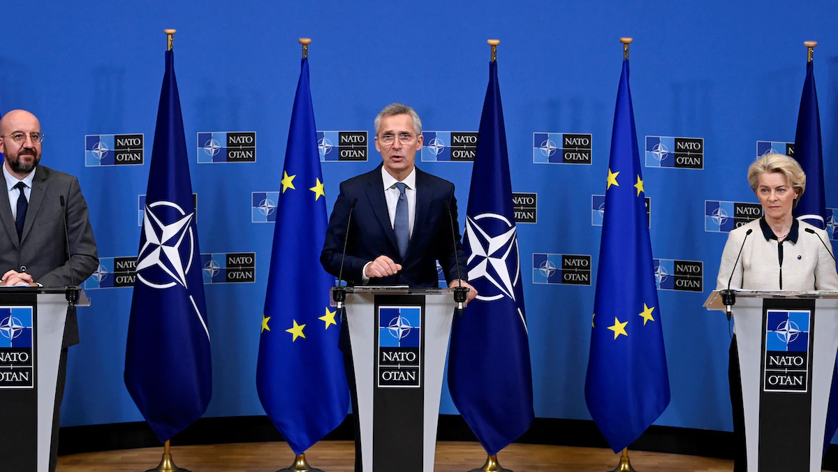 وتعهد الجانبان، الثلاثاء، بتعزيز بالتعاون ونقل شراكتهما إلى "المستوى التالي". ويضم الناتو 21 من دول الاتحاد الأوروبي. وتعهدا أيضاً تعزيز الدعم لكييف التي تخوض معارك لصد القوات الروسية الغازية.