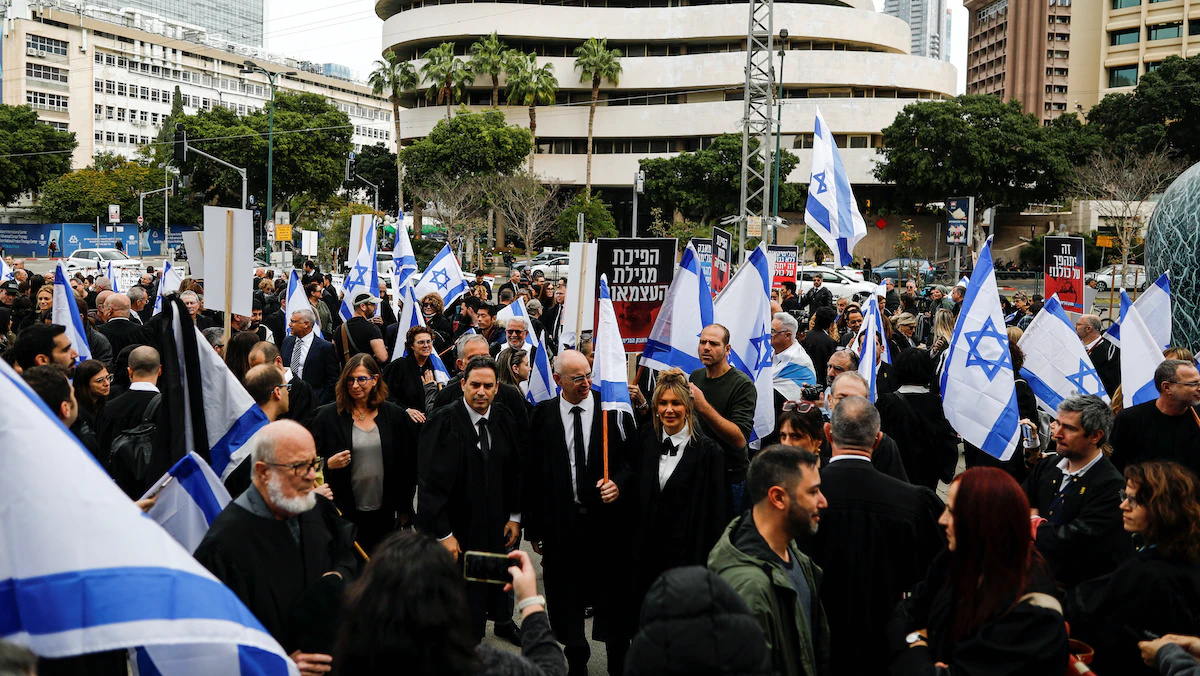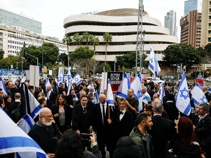 وتظاهر مئات المحامين الإسرائيليين، الخميس، أمام محكمة تل أبيب، احتجاجاً على خطة الحكومة لتعديل النظام القضائي، معتبرين أنه "يُهدد الديمقراطية".