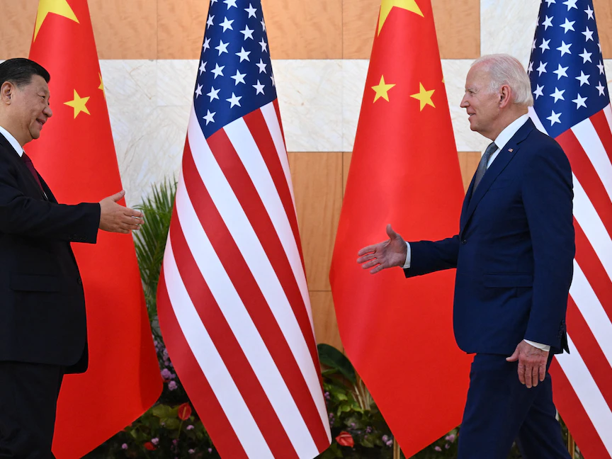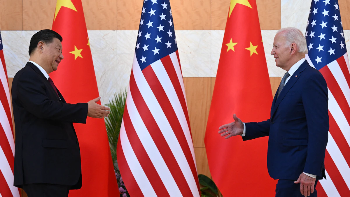 الرئيس الأميركي جو بايدن ونظيره الصيني شي جين بينج يتصافحان أثناء لقائهما على هامش قمة مجموعة الـ20 في جزيرة بالي بإندونيسيا- 14 نوفمبر 2022 - AFP