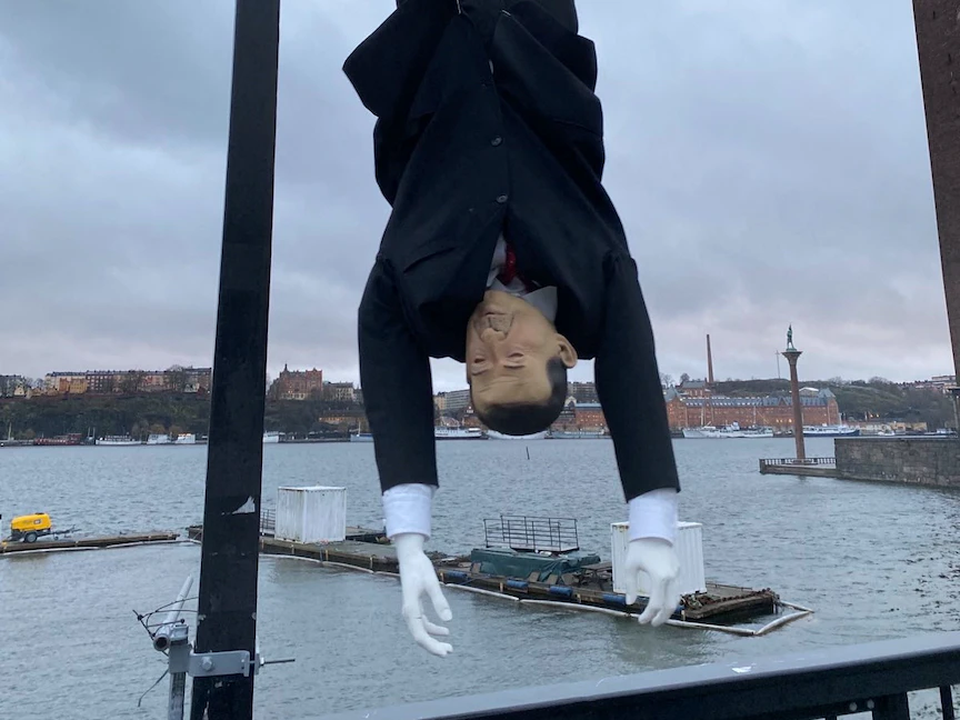 وبحسب الوكالة، فإن بعض أنصار "حزب العمال الكردستاني" تجمعوا، الخميس، أمام مبنى بلدية ستوكهولم، ثم شنقوا دمية تصور الرئيس أردوغان على عامود قرب المبنى.