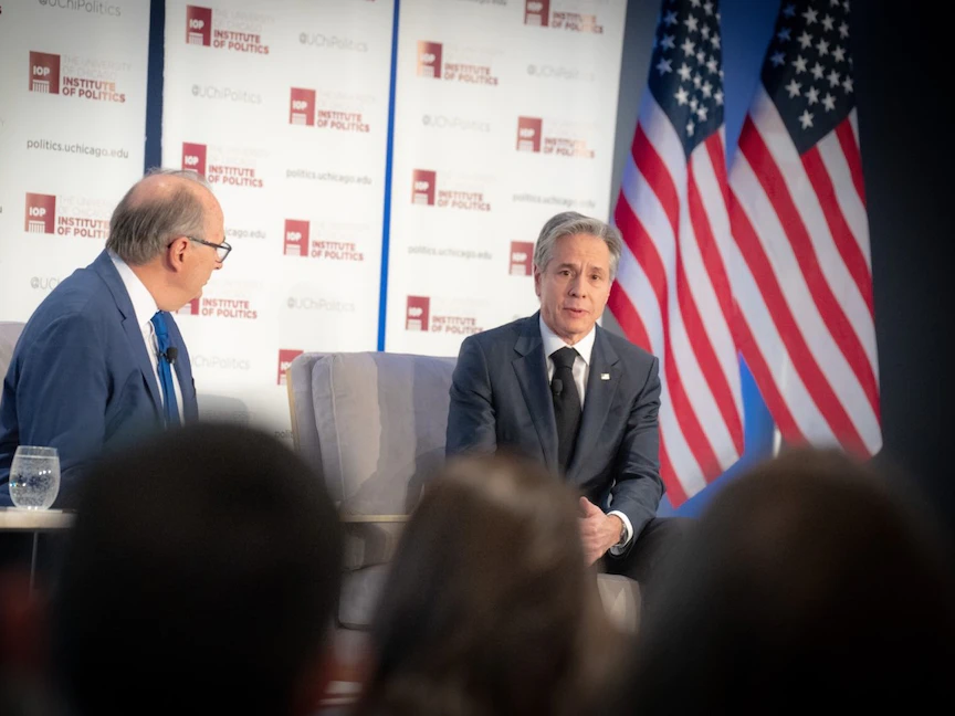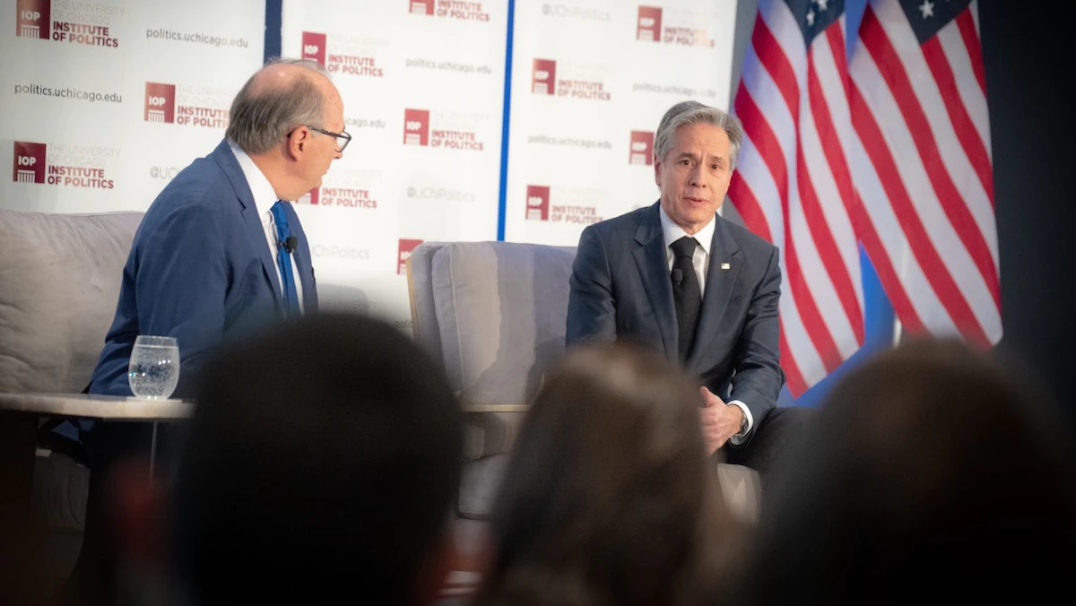 وزير الخارجية الأميركي أنتوني بلينكن يتحدث في معهد جامعة شيكاغو للسياسة وإلى جواره ديفيد أكسلرود مدير حملة باراك أوباما الانتخابية في 2008 ومؤسس المعهد، شيكاغو - 20 يناير 2023 - twitter/SecBlinken