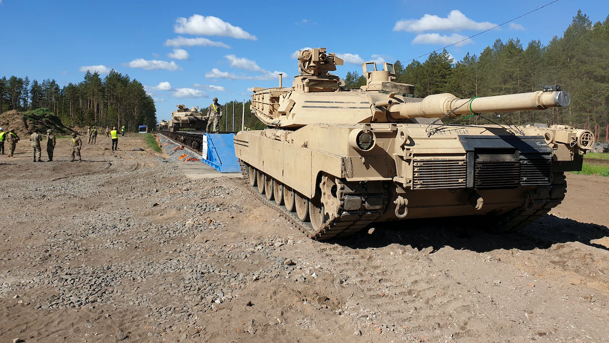 دبابات أبرامز الأميركية على سكة حديدية بساحة تدريب في ليتوانيا. 29 مايو 2020 - REUTERS
