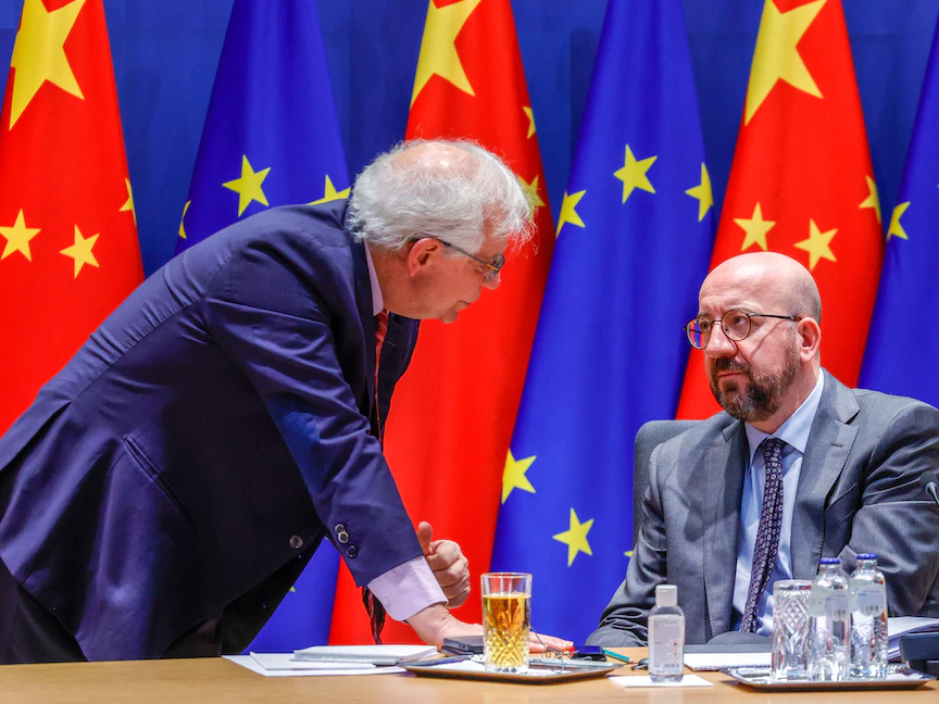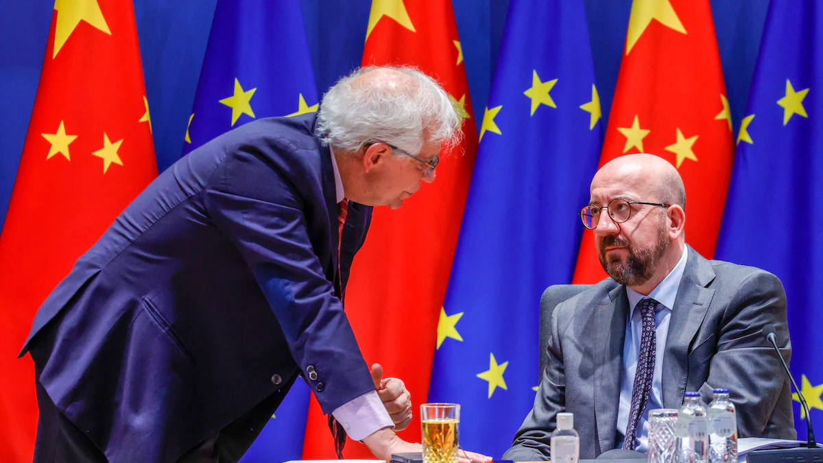 رئيس المجلس الأوروبي شارل ميشيل (يمين) ومسؤول السياسة الخارجية بالاتحاد الأوروبي جوزيب بوريل (يسار) يتحدثان في بروكسل قبل قمة افتراضية مع الصين. 1 أبريل 2022 - AFP