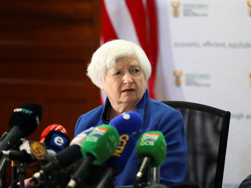 وزيرة الخزانة الأميركية جانيت يلين خلال مؤتمر صحافي على هامش زيارتها إلى جنوب إفريقيا. 26 يناير 2023 - REUTERS