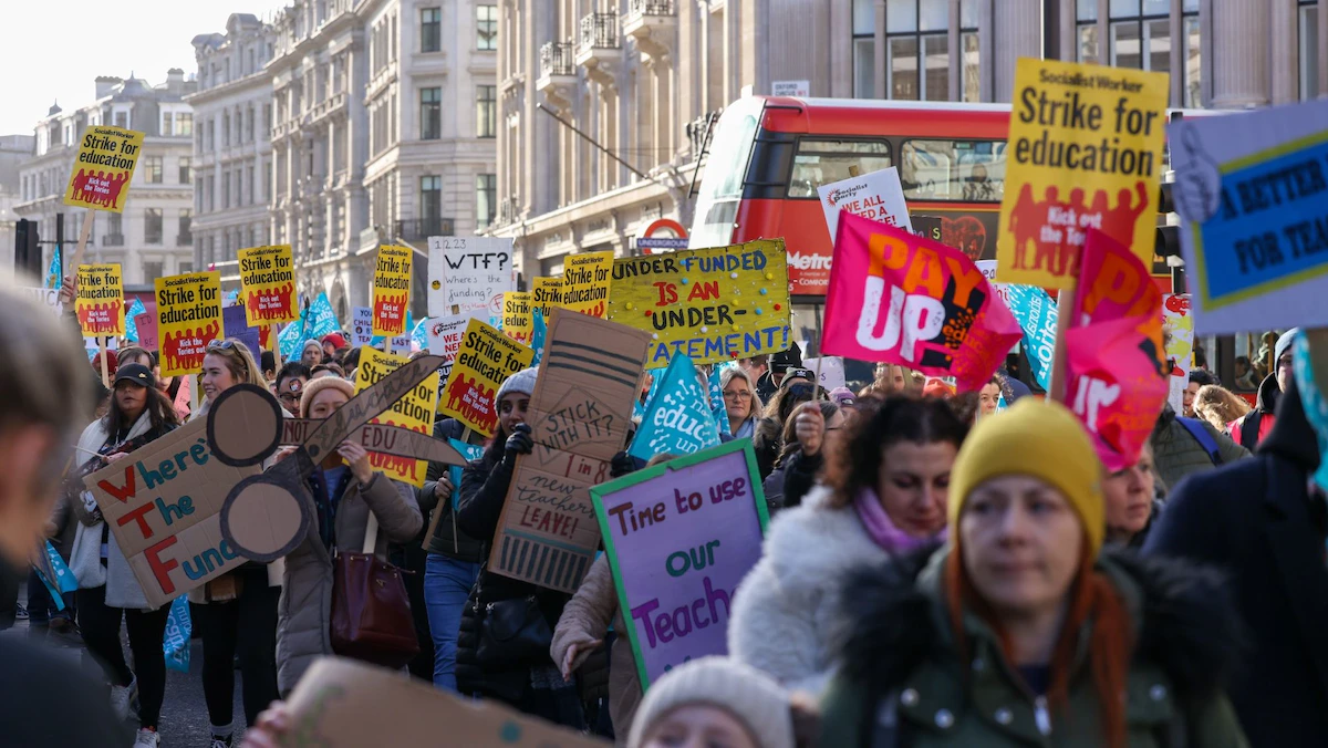 وشوهد أعضاء مضربون من الاتحاد الوطني للتعليم (NEU)، وأنصاره في طريقهم إلى بداية مسيرة من بورتلاند بليس إلى مقر وزارة التعليم في وستمنستر، احتجاجاً على خطط حكومية مثيرة للجدل لمشروع قانون لتقييد الإضرابات.