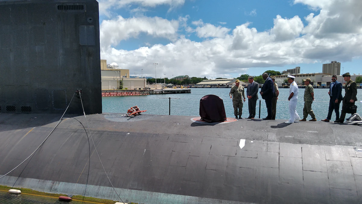 وزير الدفاع الأميركي لويد أوستن ونائب رئيس الوزراء ووزير الدفاع الأسترالي ريتشارد مارليس يزوران غواصة "يو إس إس ميسيسيبي" في بيرل هاربور هاواي. 1 أكتوبر 2022 - AFP