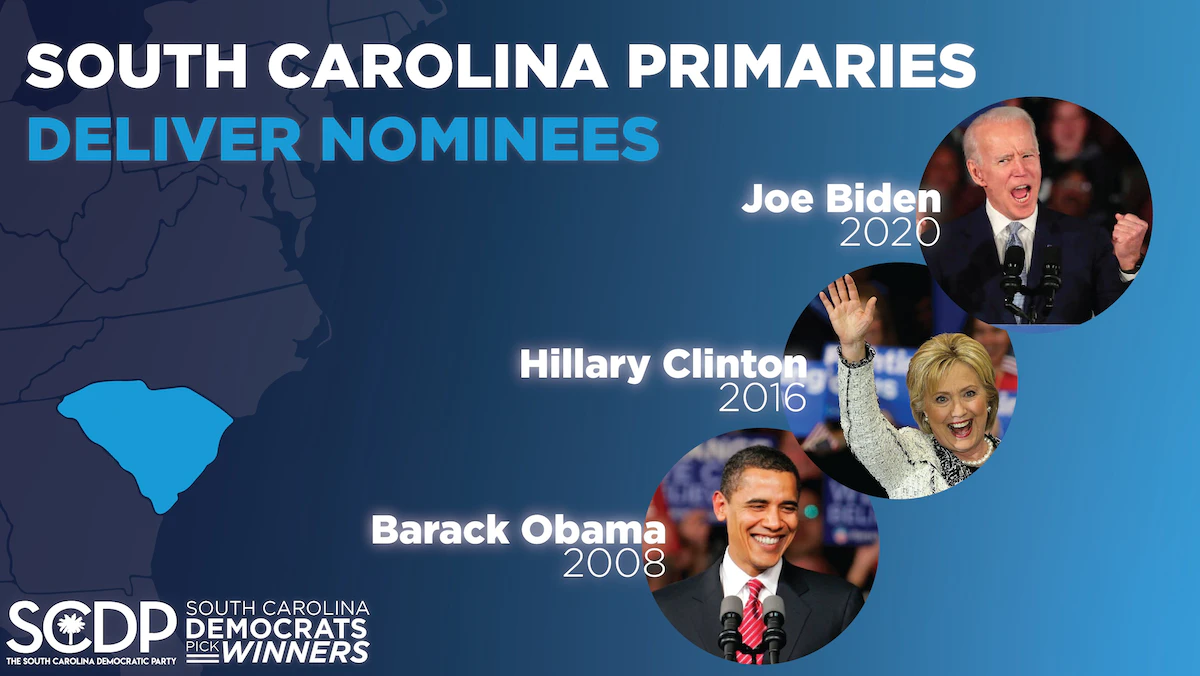 حملة ولاية ساوث كارولاينا لتثبيب اقتراح الرئيس بايدن ببدء الانتخابات التمهيدية للحزب الديمقراطي من هذه الولاية الشرقية ذات الأغلبية العرقية من أصول إفريقية - 3 فبراير 2023 - https://twitter.com/scdp/status/1621544240122662913/photo/1