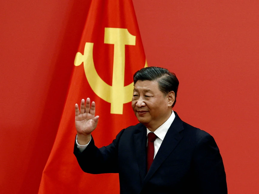 الرئيس الصيني شي جين بينج يلوح بعد إلقاء خطاب في الاجتماع الـ20 للحزب الشيوعي الصيني، القاعة الكبرى، بكين – 23 أكتوبر 2022 - REUTERS