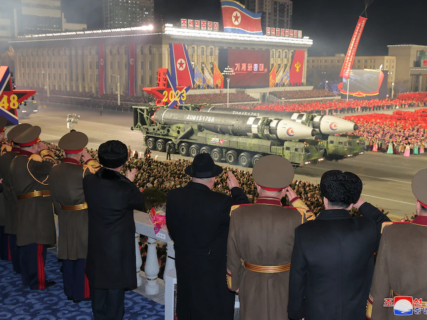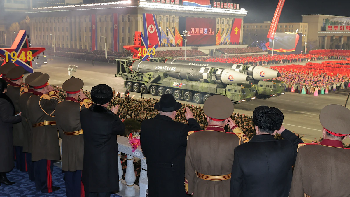 حضر الزعيم الكوري الشمالي كيم يونج أون عرضاً عسكرياً ليلياً في بيونج يانج استعرض فيه أكبر مجموعة من الصواريخ الباليستية النووية العابرة للقارات في الذكرى الـ75 لتأسيس القوات المسلحة الكورية الشمالية، فيما قال مراقبون إن هذا العدد الكبير من الصواريخ "كاف" لإغراق الدفاعات الجوية الصاروخية الأميركية حال تزويدها بعدة رؤوس حربية.