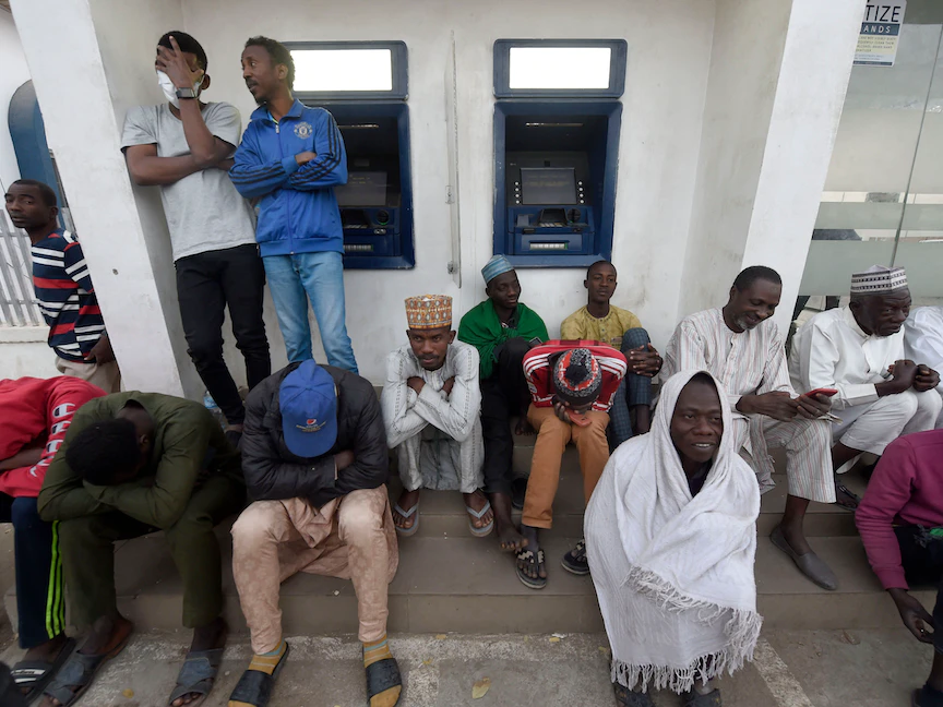 نيجيريون يجلسون في انتظار سحب الأموال من أجهزة الصراف الآلي التي أصابها نقص السيولة النقدية في مدينة كانو، شمال غرب نيجيريا - 8 فبراير 2023 - AFP