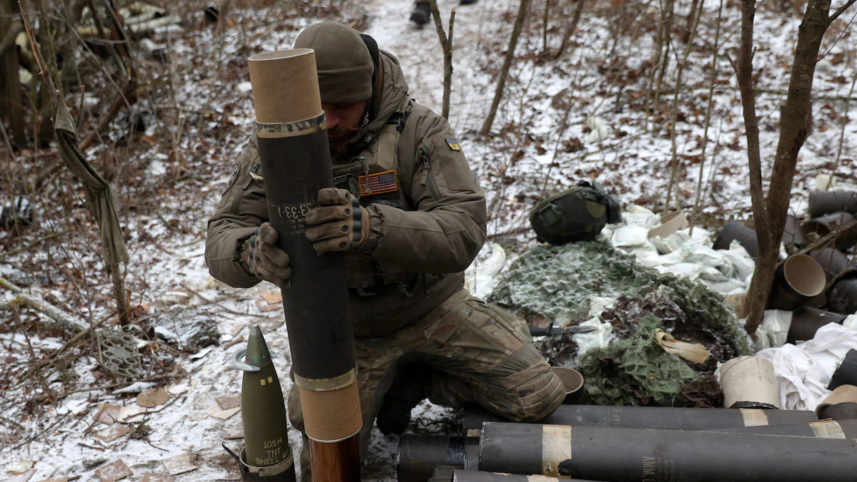 جندي مدفعية أوكراني يحضر لإطلاق قذائف "هاوتزر" تجاه مواقع روسية في الخطوط الأمامية للقتال في لوغانسك بشرق أوكرانيا. 15 يناير 2023 - AFP
