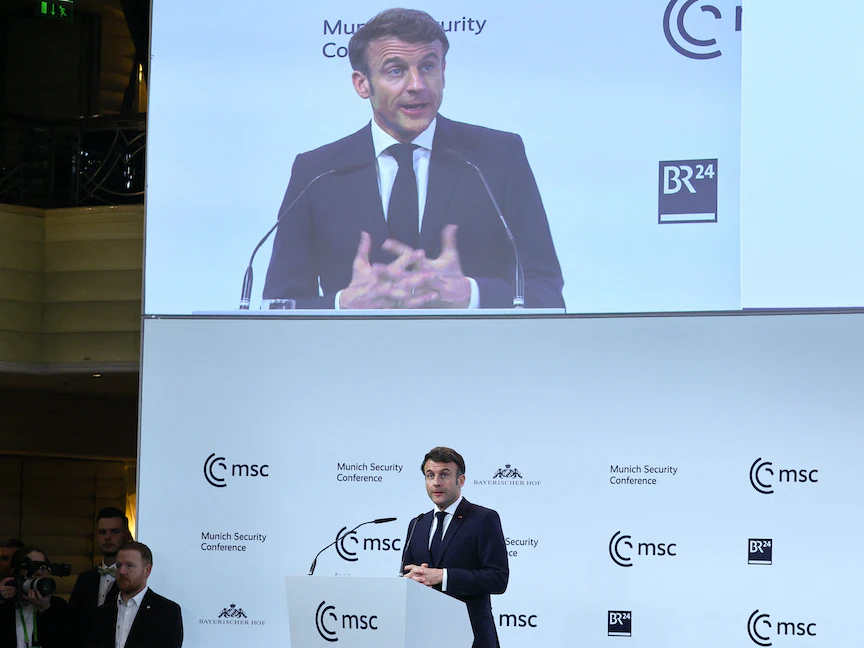 الرئيس الفرنسي إيمانويل ماكرون خلال إلقاء كلمته في مؤتمر ميونيخ للأمن. 17 فبراير 2023 - REUTERS