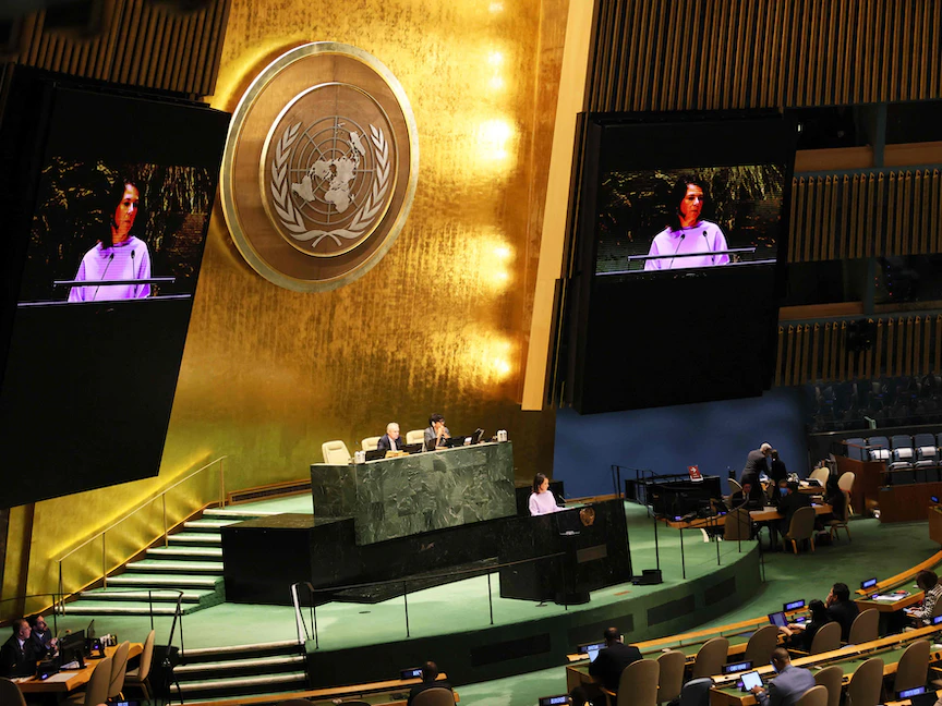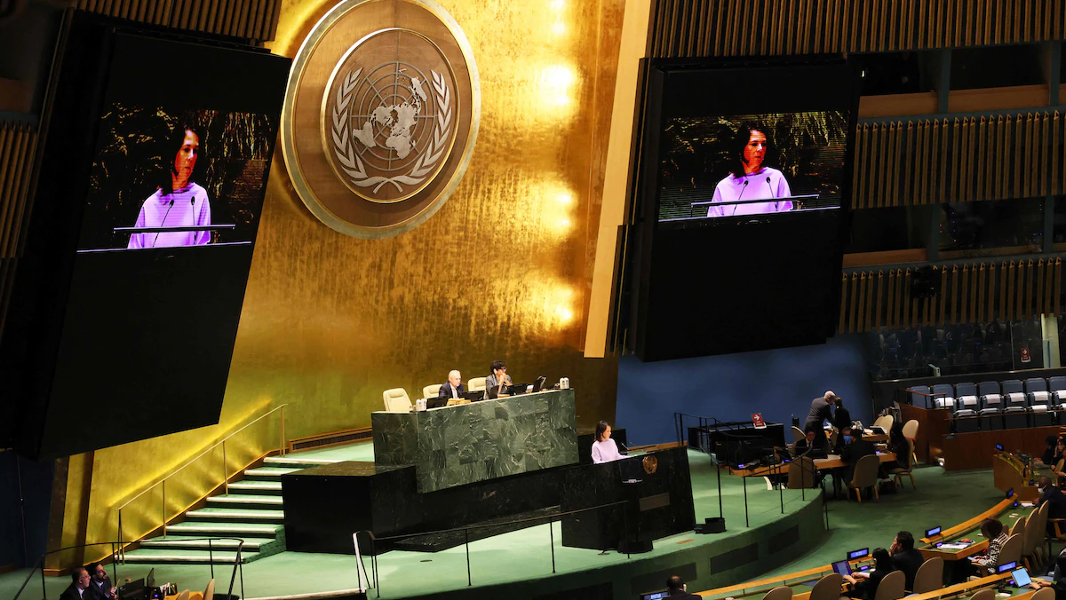 وزيرة الخارجية الألمانية أنالينا بربوك تلقي كلمة خلال جلسة خاصة للجمعية العامة في مقر الأمم المتحدة في مدينة نيويورك، 23 فبراير 2023. - Getty Images via AFP