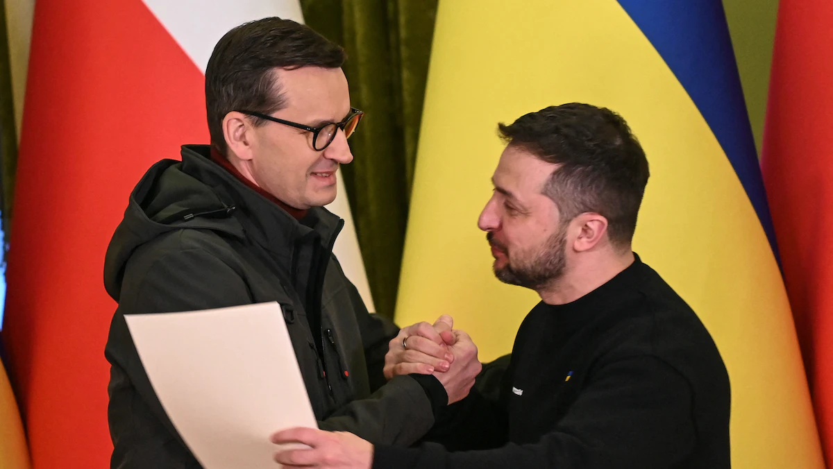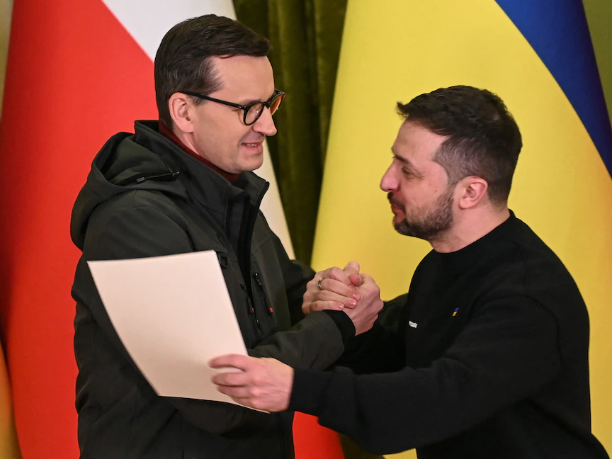الرئيس الأوكراني فولوديمير زيلينسكي مع رئيس الوزراء البولندي ماتيوز مورافيكي في كييف. 24 فبراير 2023 - REUTERS