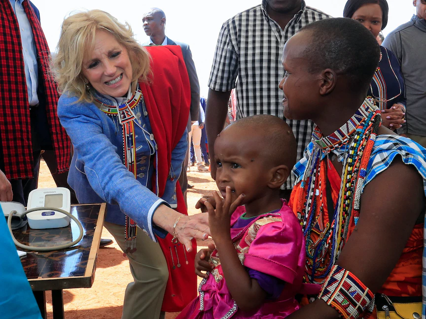 زارت السيدة الأميركية الأولى جيل بايدن، الأحد، مناطق متضررة من الجفاف في كينيا، وناشدت الدول الغنية تقديم المزيد من الدعم، فيما يُعاني القرن الإفريقي أسوأ موجة جفاف منذ عقود.