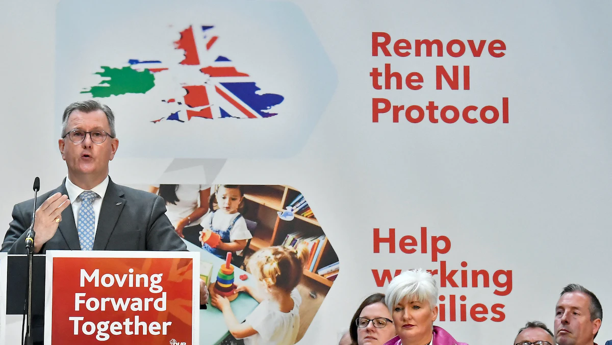 زعيم الحزب الوحدوي الديمقراطي في إيرلندا الشمالية السير جيفري دونالدسون خلال مؤتمر حزبي في كريجافون، إيرلندا الشمالية - 28 أبريل 2022 - REUTERS