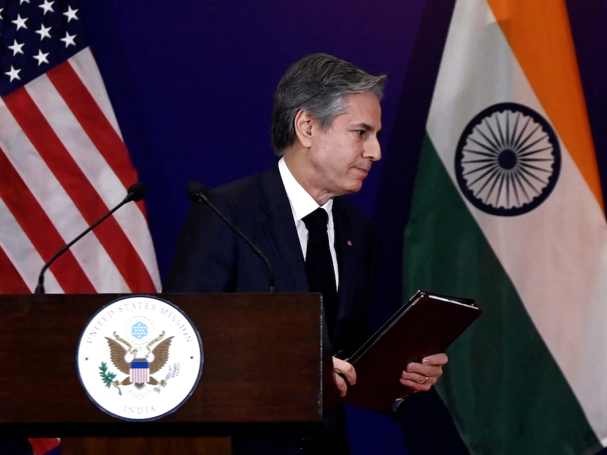 وزير الخارجية الأميركي أنتوني بلينكن عقب مؤتمر صحافي على هامش اجتماعات مجموعة العشرين في نيودلهي. 2 مارس 2023 - AFP