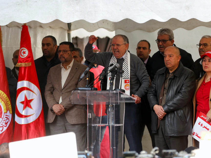 نظم الاتحاد العام التونسي للشغل، السبت، احتجاجاً مناهضاً للرئيس قيس سعيد في العاصمة، هو الأكبر