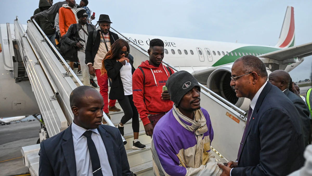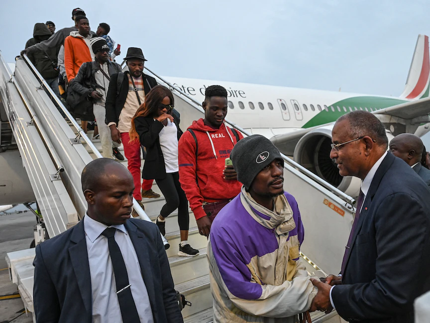 مواطنون من ساحل العاج يهبطون في مطار فيليكس هوفويت بوانيي في أبيدجان من طائرة أعادتهم من تونس. 4 مارس 2023 - AFP