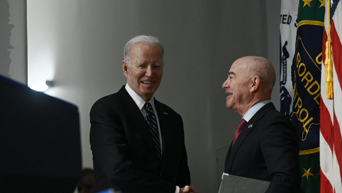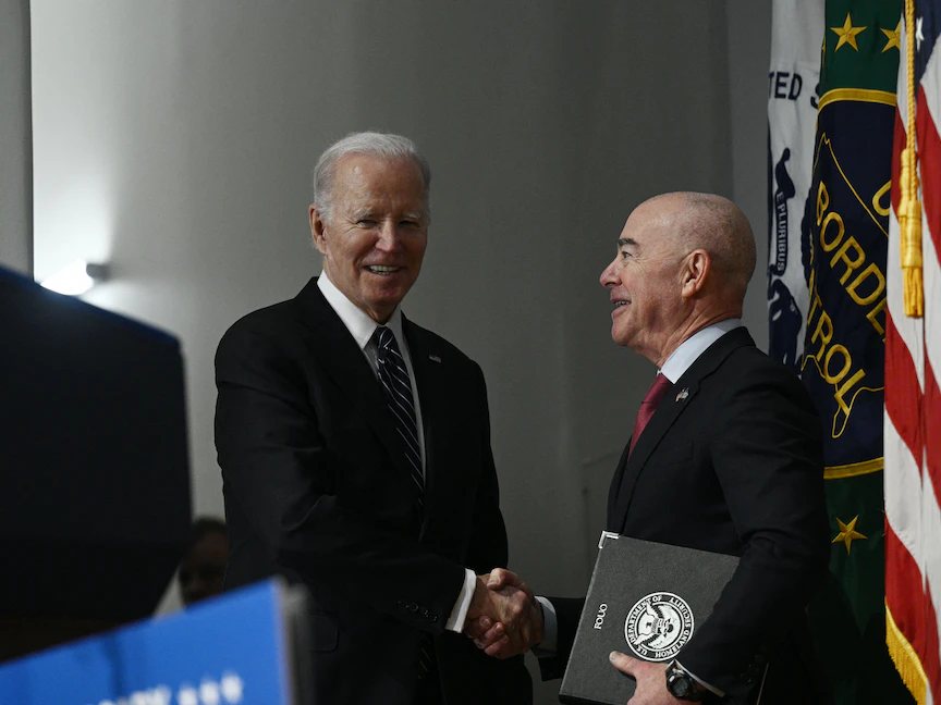 الرئيس الأميركي جو بايدن مع وزير الأمن الداخلي أليخاندرو مايوركاس في حفل بمقر الوزارة في واشنطن. 1 مارس 2023 - AFP
