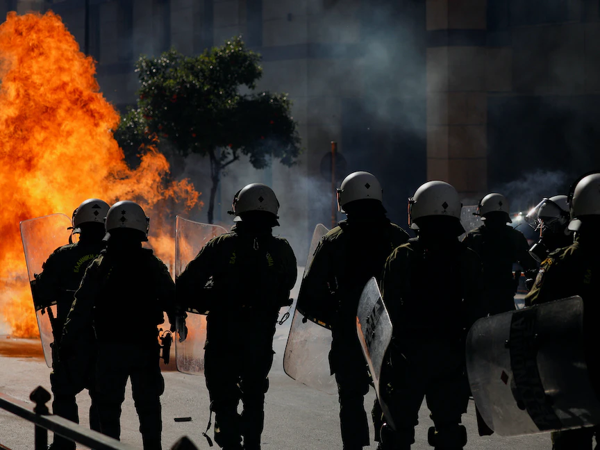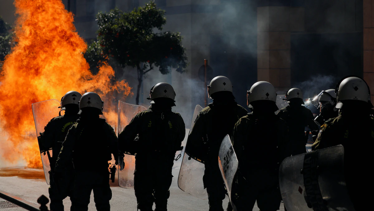 شرطة مكافحة الشغب قرب ألسنة النار خلال اشتباكات مع محتجين عقب حادث قطار في أثينا. 8 مارس 2023 - REUTERS