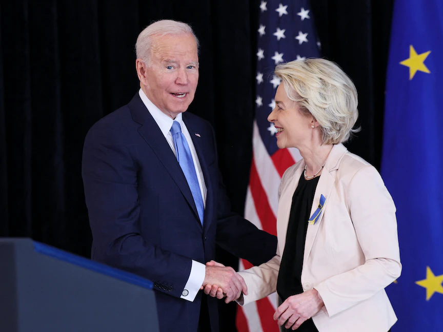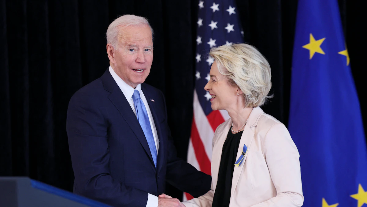 الرئيس الأميركي جو بايدن ورئيسة المفوضية الأوروبية أورسولا فون دير لاين يتصافحان في بروكسل، بلجيكا. 25 مارس 2022 - REUTERS